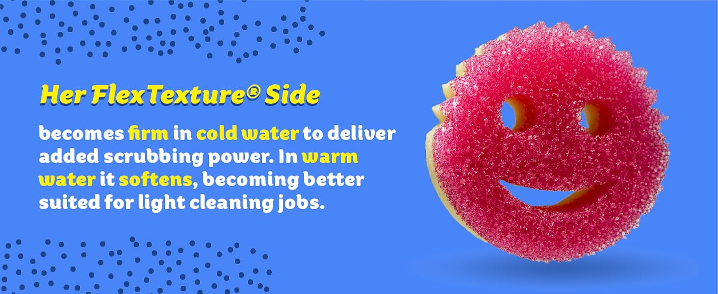 The Scrub Mommy features a dual-sided design with a firm FlexTexture® scrubber and a soft ResoFoam® sponge.